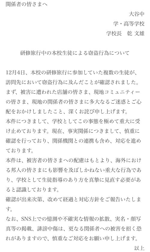12月8日の学校長名義の声明で「複数の生徒が窃盗行為に及んだ」と認め、被害者や海外の日本人への影響を深刻に受け止めています。